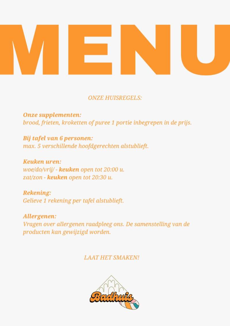 Ontdek de smakelijke wereld van Badhuis op onze Menu pagina. Hier vindt u een selectie van onze populaire gerechten, met dagmenu's en seizoensgebonden specialiteiten die uw smaakpapillen zullen verwennen. Geniet van een gezellige sfeer en heerlijke maaltijden, allemaal binnen een betaalbaar prijsbereik van 15-25 euro.